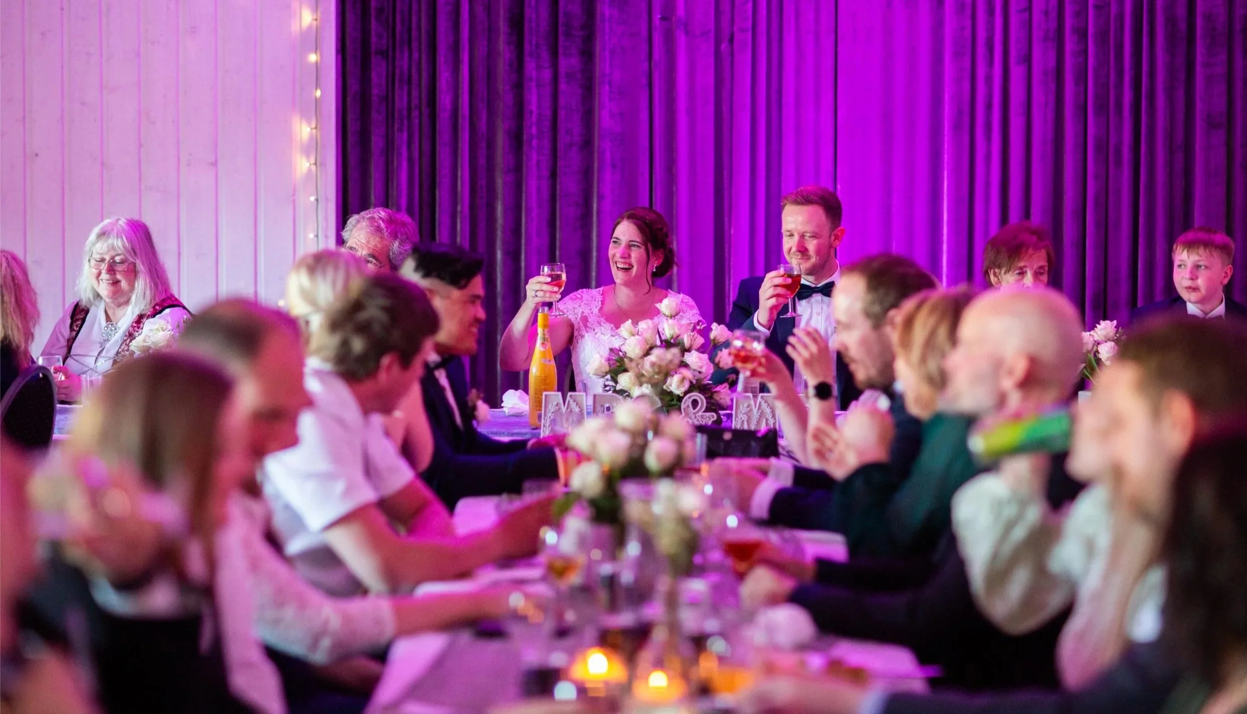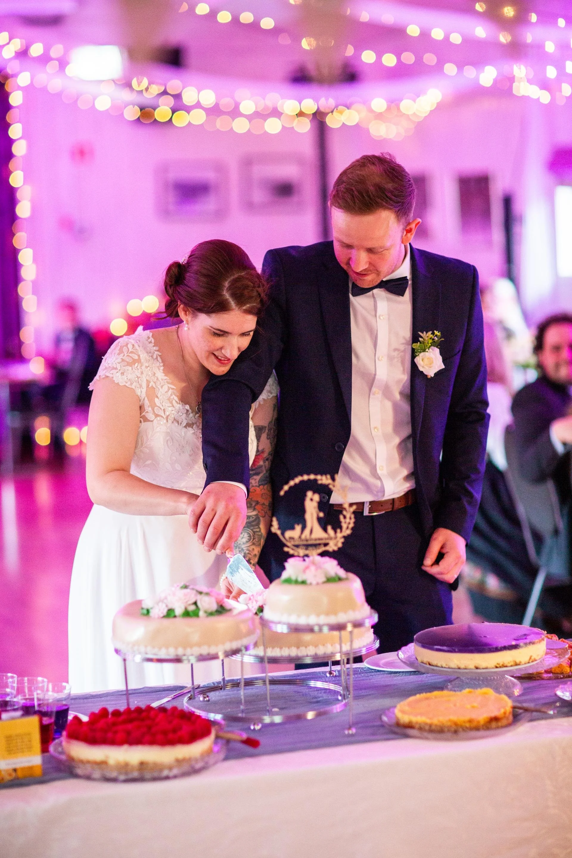 Lysforholdene i selskapslokalet er også etter forholdene gode. Man bør likevel være obs på blandingslys mellom varmt innelys og kaldt utelys, som er vanlig i mange lokaler der det kalde lysinnslippet fra vinduene blir kompensert med varmt innelys for at lokalet skal oppleves lyst nok. Dette kan gjøre jobben mer utfordrende for fotografen i lokalet. På de vedlagte bildene har brudeparet brukt profesjonell belysning for å skape spennende lysforhold i lokalet.